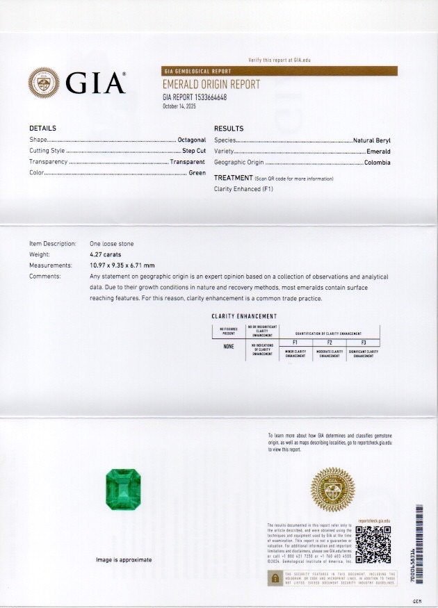 4.27CT AAA Green Emerald Cut Emerald$20,496.00 GEM TYPE Emerald WEIGHT (CT) 4.27 COLOR AAA Green SHAPE Emerald Cut TREATMENT N/A CLARITY NA SIZE MM 10.98 x 9.31 x 6.68 ORIGIN Colombia 1 in stock 4.27CT AAA Green Emerald Cut Emerald quantity Buy now SKU: EM21 Category: Emerald Product ID: 187332 Description Description Certification GIA